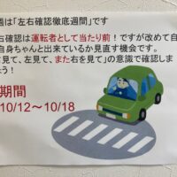今週は「左右確認徹底週間」です。 ちょっとした確認が大きな安全に繋がります。 「見たつもり」「来ないだろう」ではなく、しっかり目で確認をして安全意識を高めたいと思います。